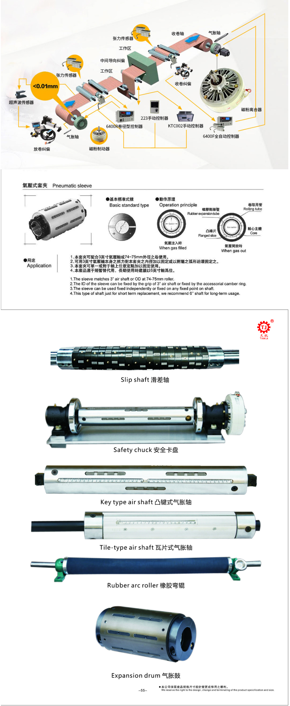 或“气胀套”主要有前套、后套、筒体、内管、气囊、凸键盘等零件组成。气胀套夹适用于涂布、印刷、复卷、造纸、塑料等相关机械的收放等。特别在三、六寸气涨轴频繁使用负载较轻的场合,更显示出其优越性。