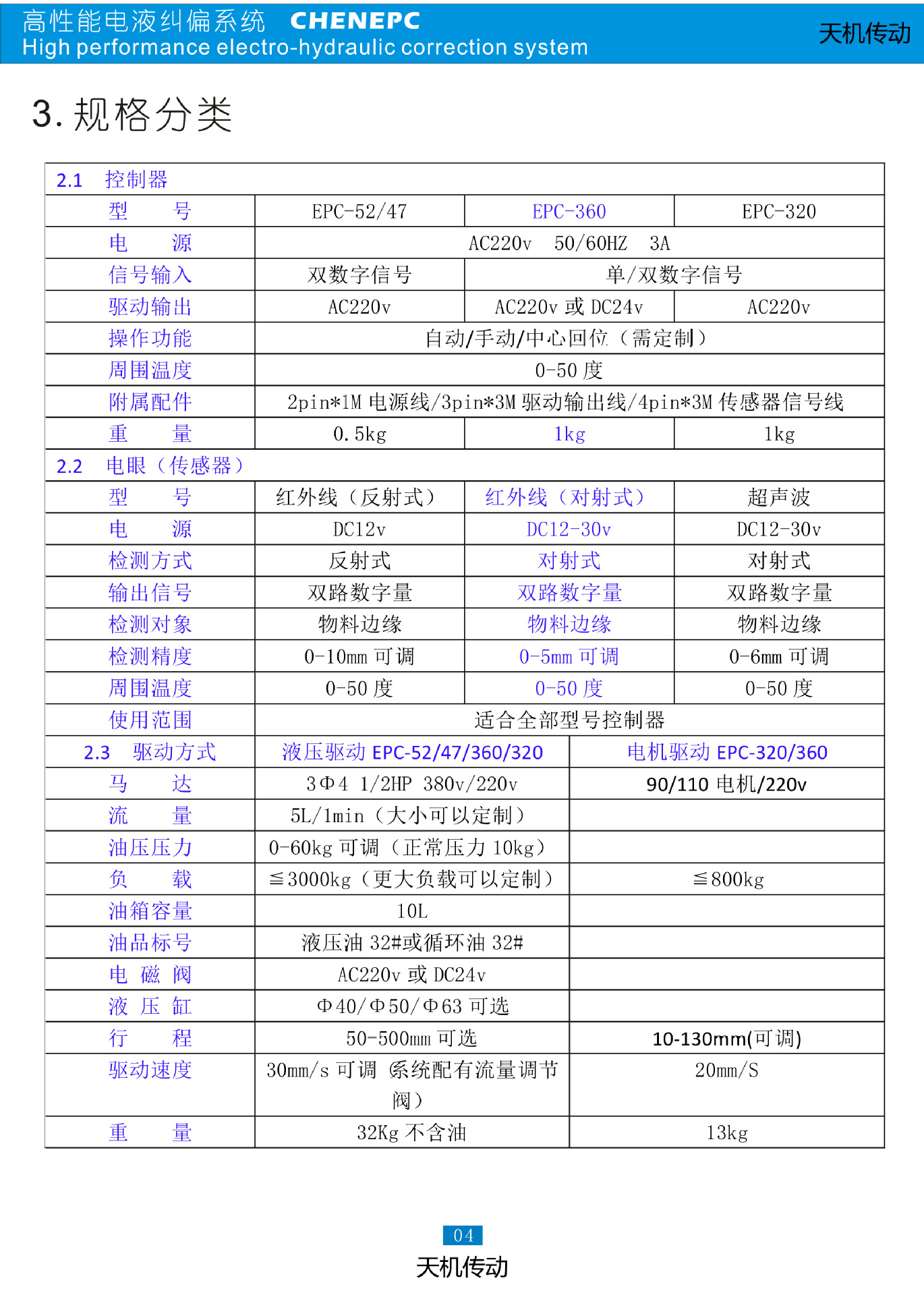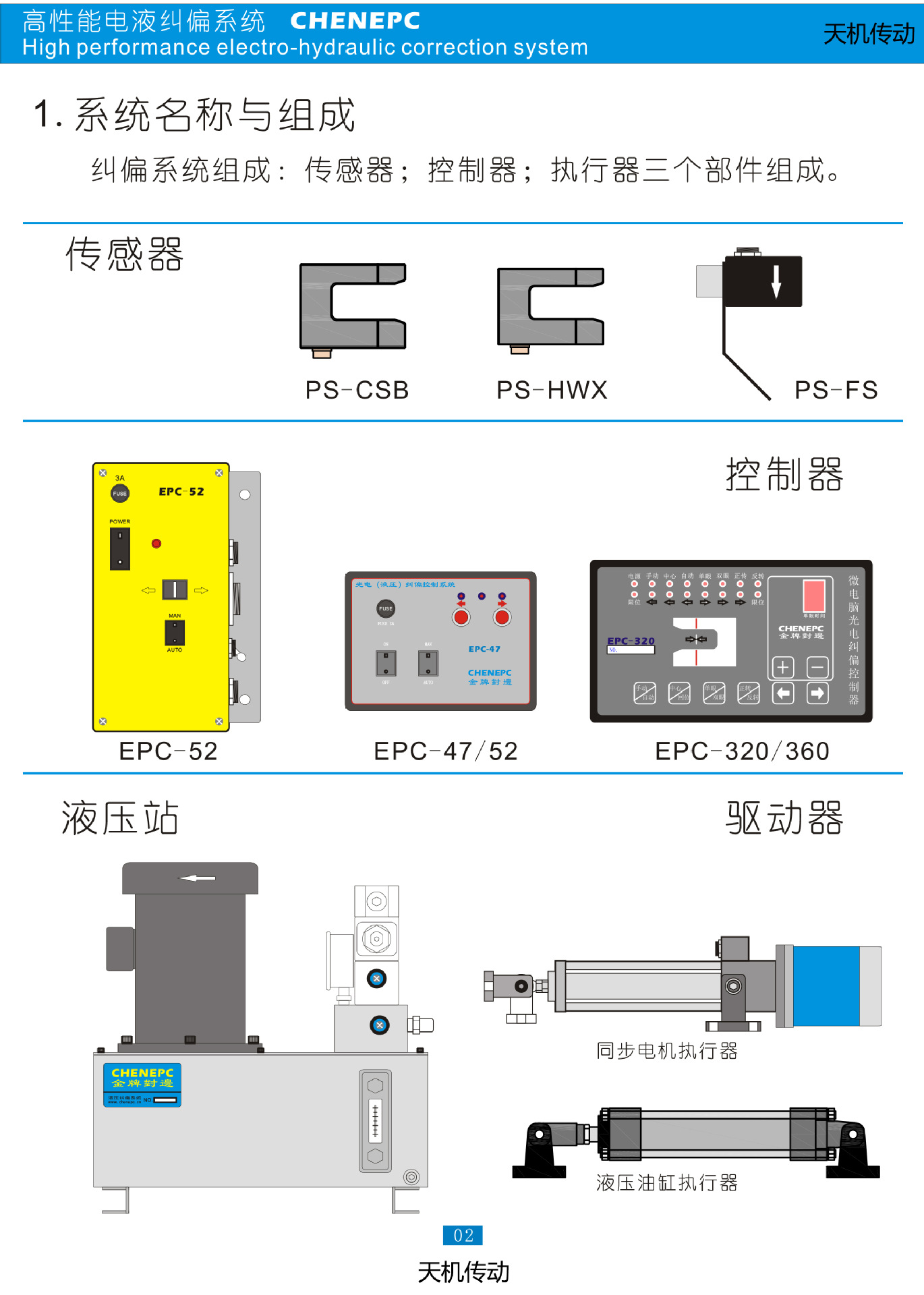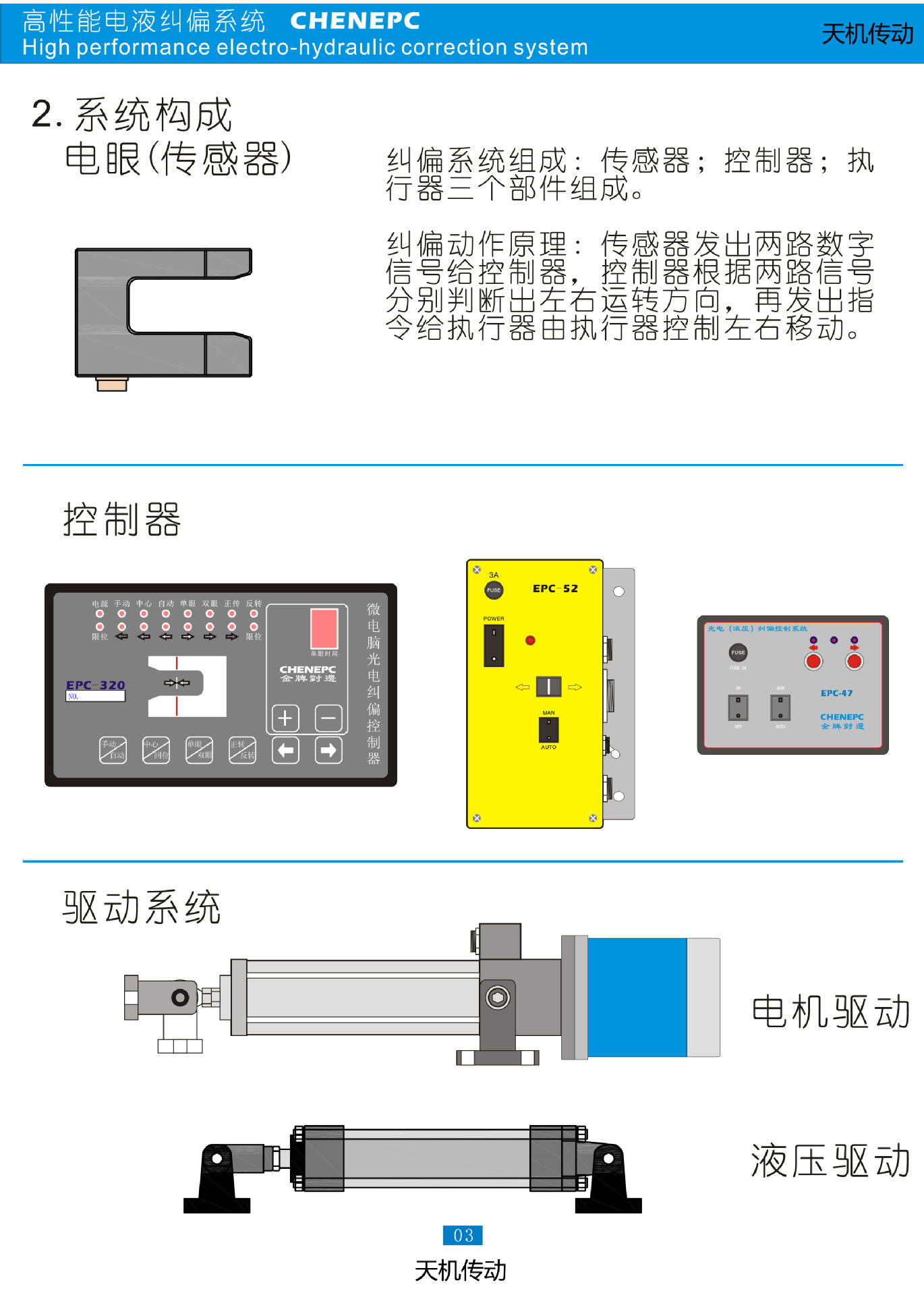 液压纠偏系统EPC-47W、47、49、52、52L、67、均用光电检出,油压驱动,对透明料、不透明料、半透明料、纲格料、均可检知修正。 应对速度:0.01秒以内。最大负荷可由3顿-20顿多种选择。