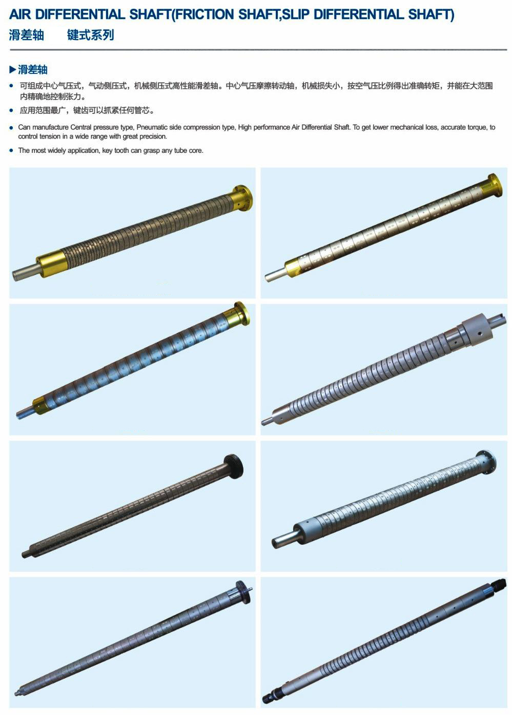滑差式气胀轴主要用于分条产品质量要求比较高、速度比较快的分条设备。气涨轴特殊分段,独立打滑及扭力设定结构,它将能解决分条每一卷材料因厚薄及张力不均所造成的脱卷现象,能有效提高产品质量及工效。